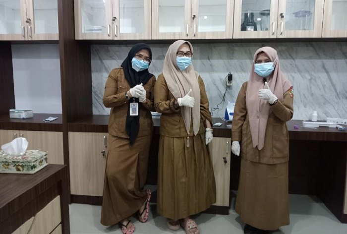 Kepala Bidang Konsumsi dan Keamanan Pangan, Yarnengsih Alam , Pengawas Mutu Hasil Pertanian, Dewi Sri Rejeki dan Ceria Dona Lagizasvera melakukan pengujian PSAT di Labor Disketapang Pekanbaru.