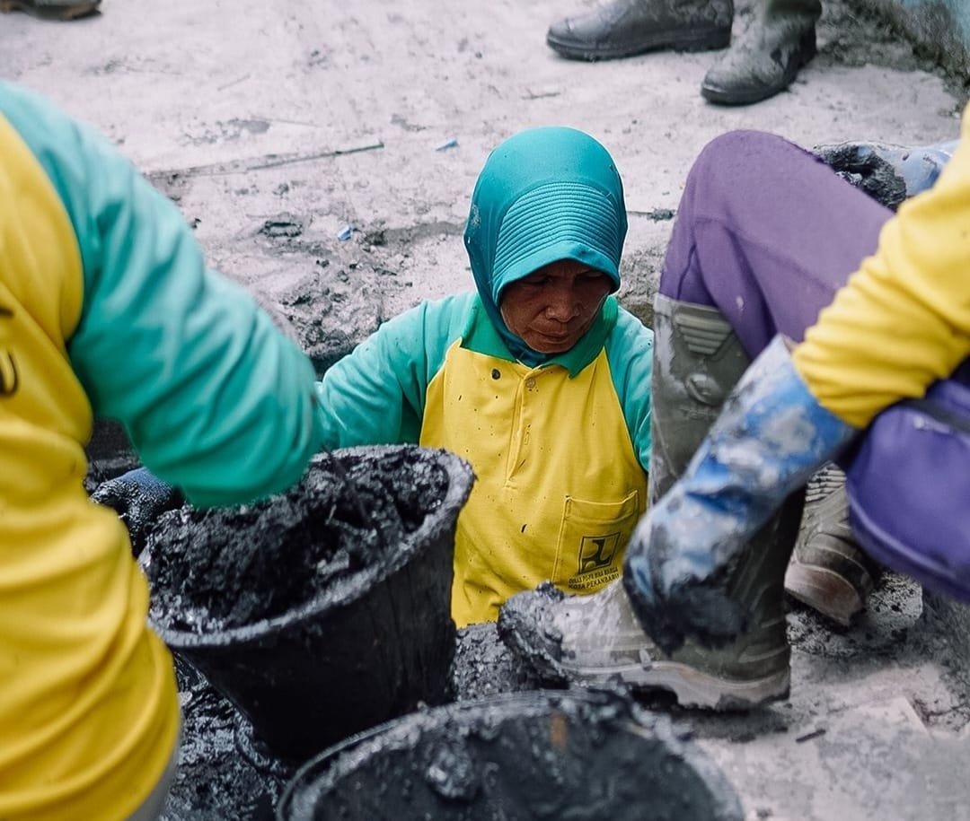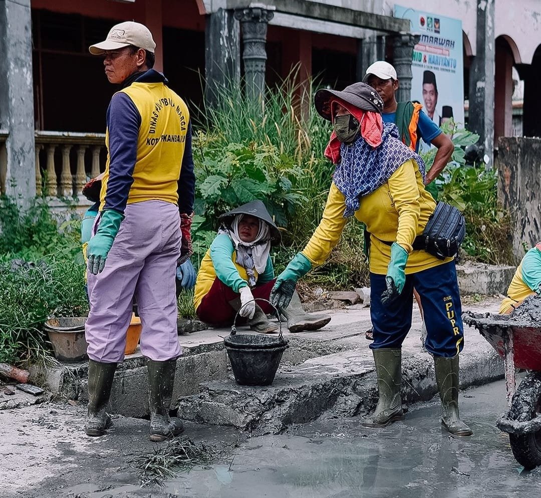 Tim pasukan kuning dengan telaten membersihkan drainase. Drainase Jalan Cempaka dipenuhi oleh sedimen dan sampah limbah plastik secara manual.